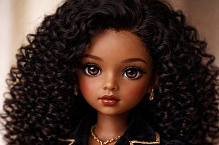 A porcelain shell, soft quilted limbs, cheeks blushed with acrylic paint. Synthetic hairs for lashes. Black suede dress with white lace trim & gold…